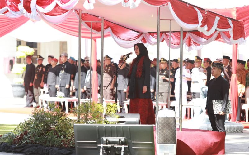 Banyuwangi – Upacara peringatan Hari Jadi ke 80 Provinsi Jawa Timur di Kabupaten Banyuwangi berlangsung khidmat. Bupati Banyuwangi Ipuk Fiestiandani memimpin langsung upacara yang berlangsung di Halaman Kantor Bupati Banyuwangi, Minggu (12/10/2025).